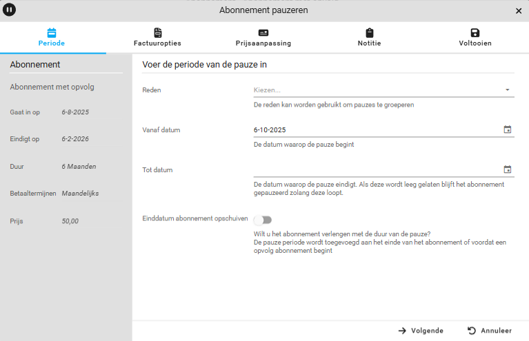 Er is een nieuw scherm ontwikkeld om het toevoegen van abonnement pauzes inzichtelijker te maken.