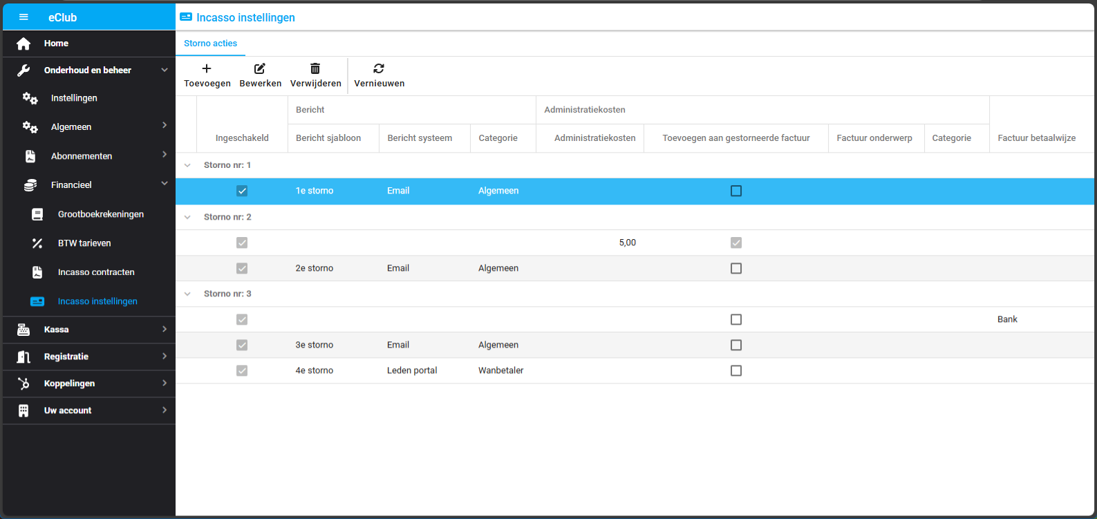 Navigeer naar het onderdeel [Onderhoud en Beheer][Financieel][Incasso instellingen] om de storno acties te onderhouden.