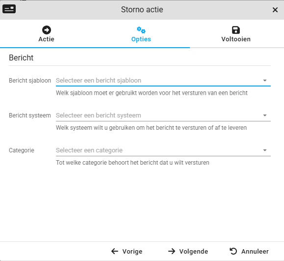 Selecteer het juiste sjabloon voor het bericht en kies het systeem wat gebruikt dient te worden om het bericht af te leveren. U kunt optioneel een categorie voor het bericht selecteren zodat deze later eenvoudig terug te vinden is.