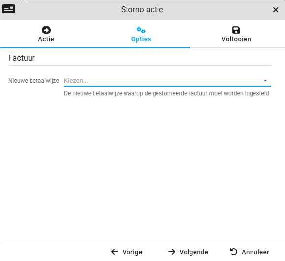 Selecteer de nieuwe betaalwijze waarop de gestorneerde factuur moet worden ingesteld met het bereiken van het storno nummer.