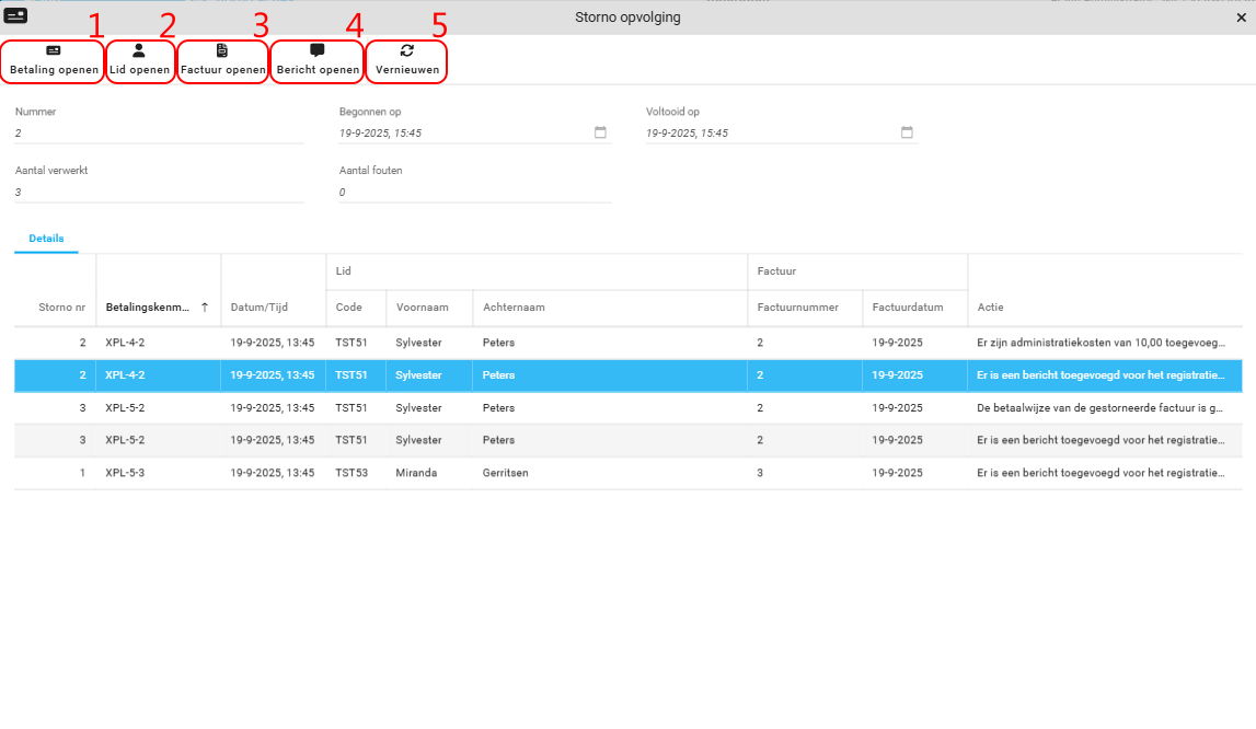 Hier vind u een overzicht van de uitgevoerde acties per storno en eventuele fouten voor acties die niet konden worden uitgevoerd.
